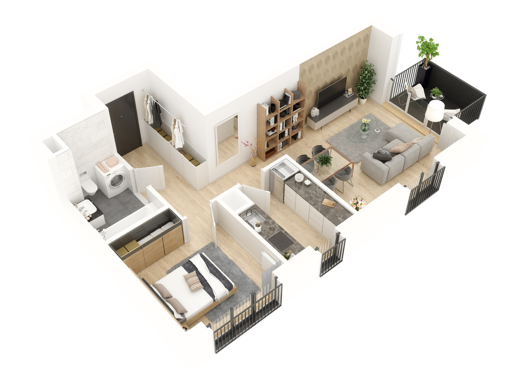 Urządzenia sanitarne i kuchenne, drzwi wewnątrzlokalowe oraz materiały wykończeniowe podłóg nie stanowią wyposażenia lokali mieszkalnych. Rozmieszczenie wyposażenia przedstawiono jako przykładowe.