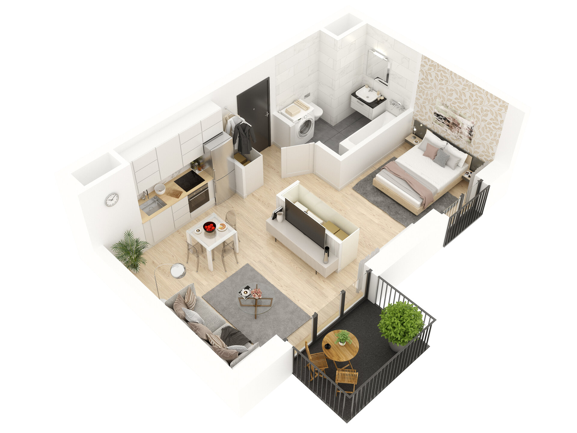 Urządzenia sanitarne i kuchenne, drzwi wewnątrzlokalowe oraz materiały wykończeniowe podłóg nie stanowią wyposażenia lokali mieszkalnych. Rozmieszczenie wyposażenia przedstawiono jako przykładowe.