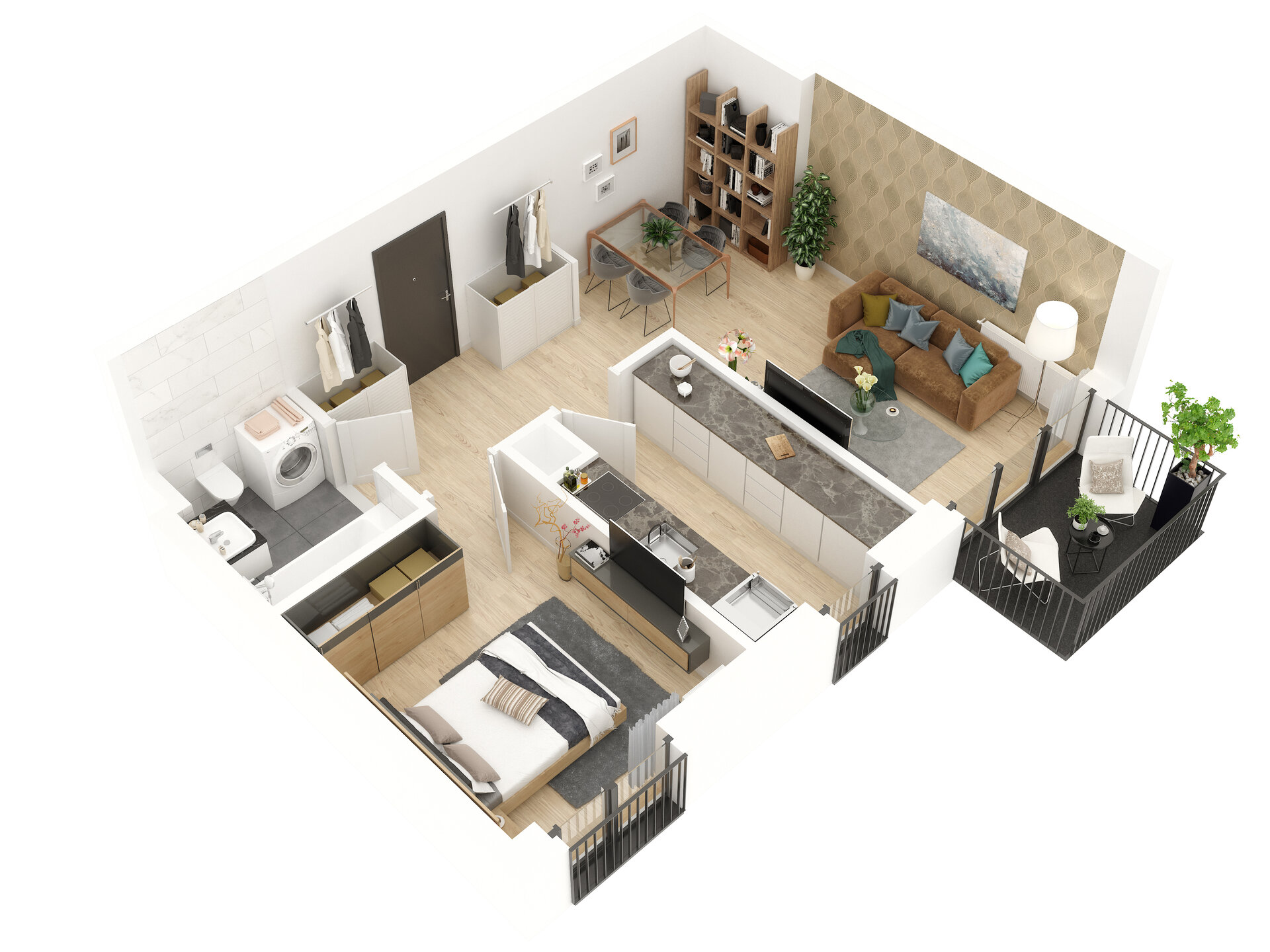 Urządzenia sanitarne i kuchenne, drzwi wewnątrzlokalowe oraz materiały wykończeniowe podłóg nie stanowią wyposażenia lokali mieszkalnych. Rozmieszczenie wyposażenia przedstawiono jako przykładowe.