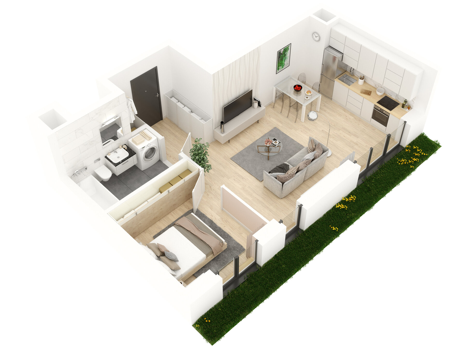 Urządzenia sanitarne i kuchenne, drzwi wewnątrzlokalowe oraz materiały wykończeniowe podłóg nie stanowią wyposażenia lokali mieszkalnych. Rozmieszczenie wyposażenia przedstawiono jako przykładowe.