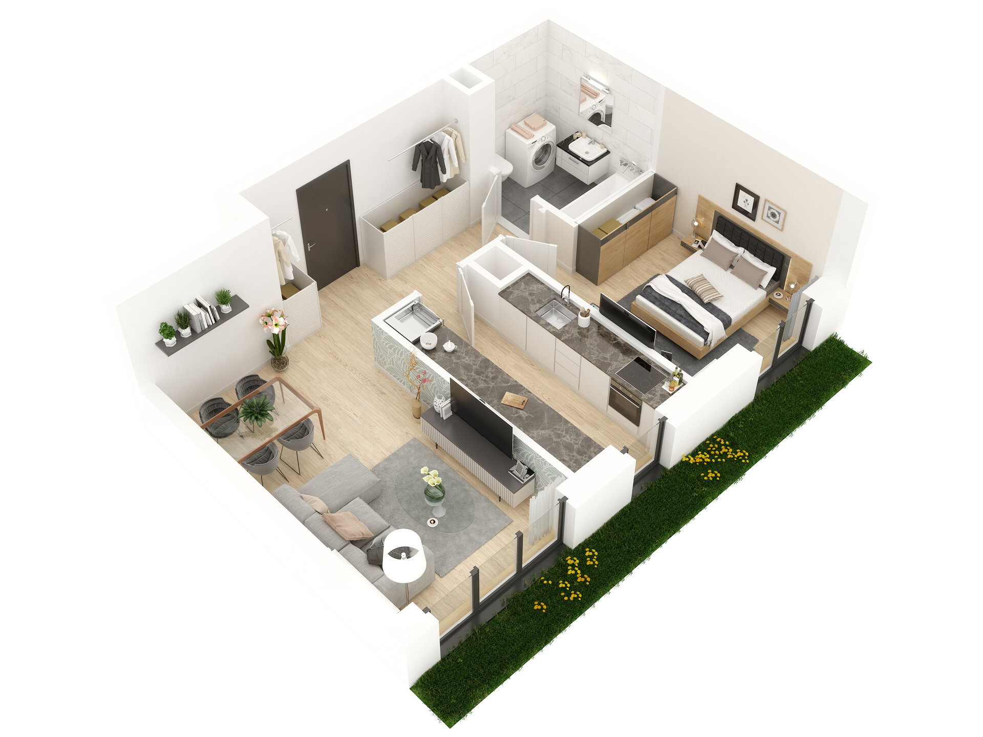 Urządzenia sanitarne i kuchenne, drzwi wewnątrzlokalowe oraz materiały wykończeniowe podłóg nie stanowią wyposażenia lokali mieszkalnych. Rozmieszczenie wyposażenia przedstawiono jako przykładowe.