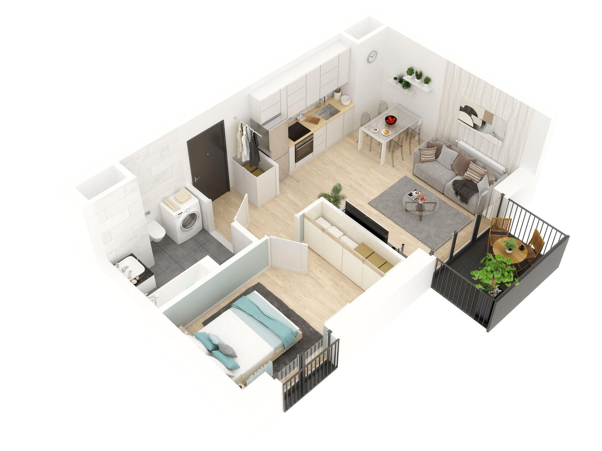 Urządzenia sanitarne i kuchenne, drzwi wewnątrzlokalowe oraz materiały wykończeniowe podłóg nie stanowią wyposażenia lokali mieszkalnych. Rozmieszczenie wyposażenia przedstawiono jako przykładowe.