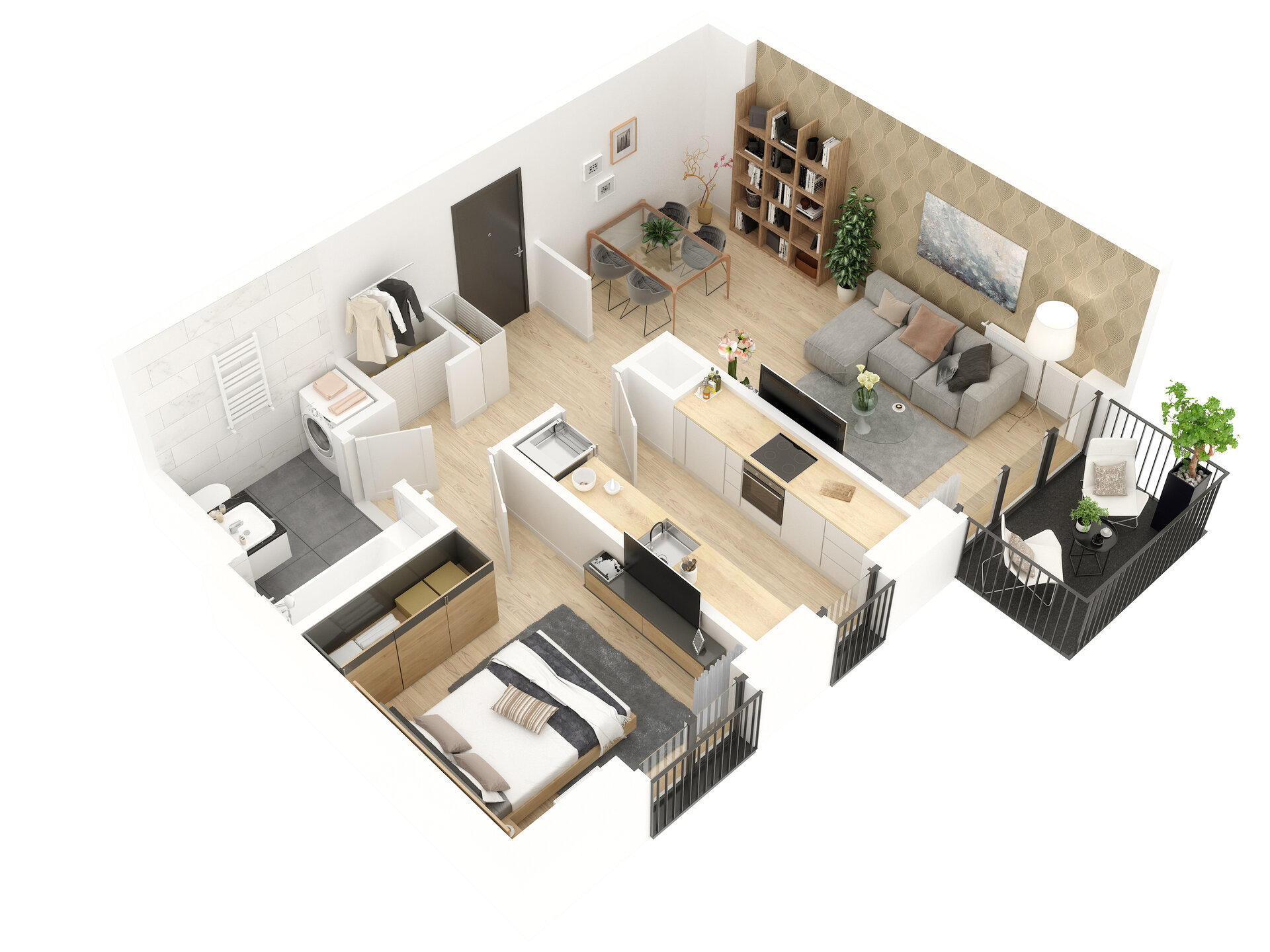 Urządzenia sanitarne i kuchenne, drzwi wewnątrzlokalowe oraz materiały wykończeniowe podłóg nie stanowią wyposażenia lokali mieszkalnych. Rozmieszczenie wyposażenia przedstawiono jako przykładowe.
