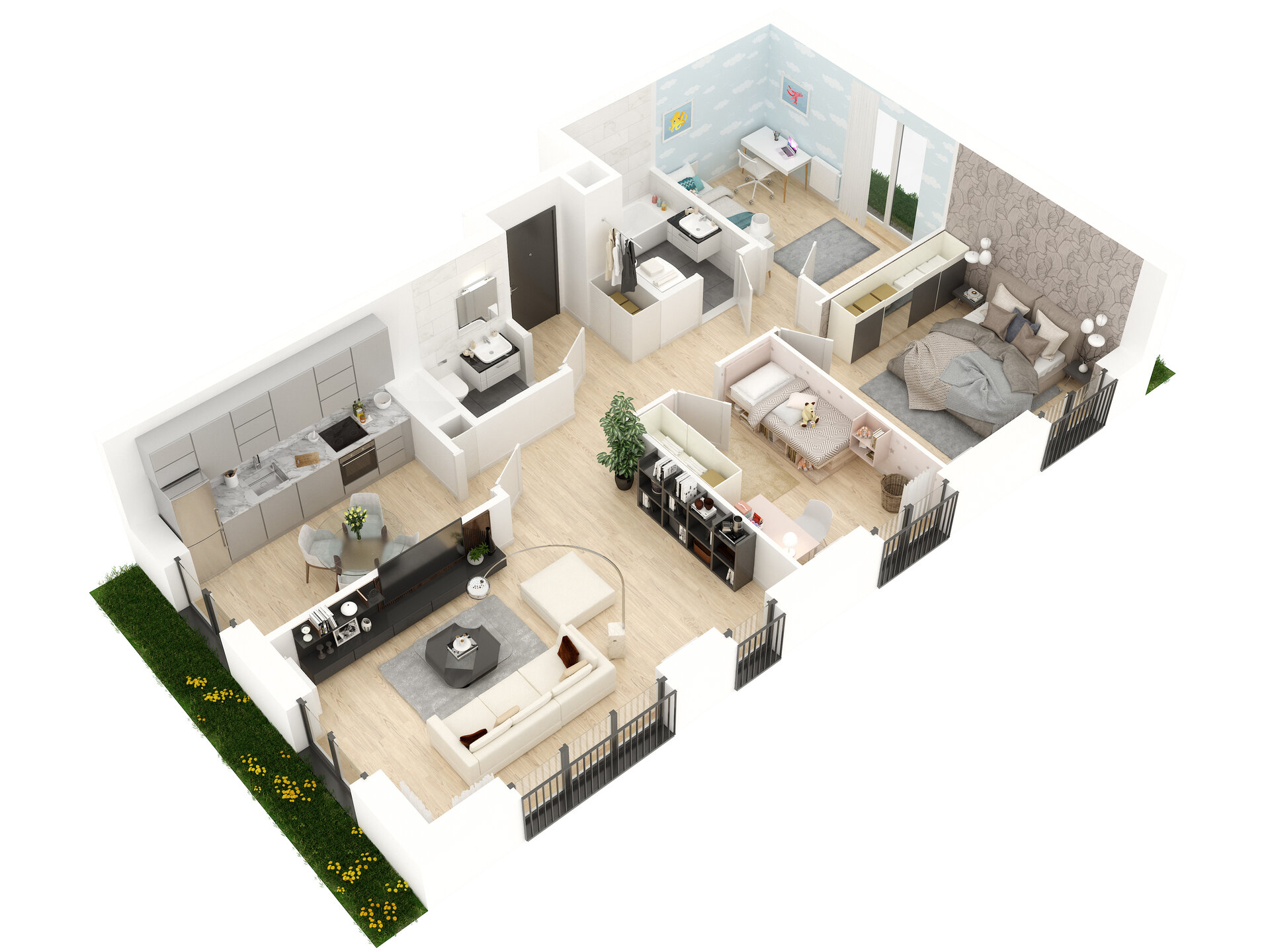 Urządzenia sanitarne i kuchenne, drzwi wewnątrzlokalowe oraz materiały wykończeniowe podłóg nie stanowią wyposażenia lokali mieszkalnych. Rozmieszczenie wyposażenia przedstawiono jako przykładowe.