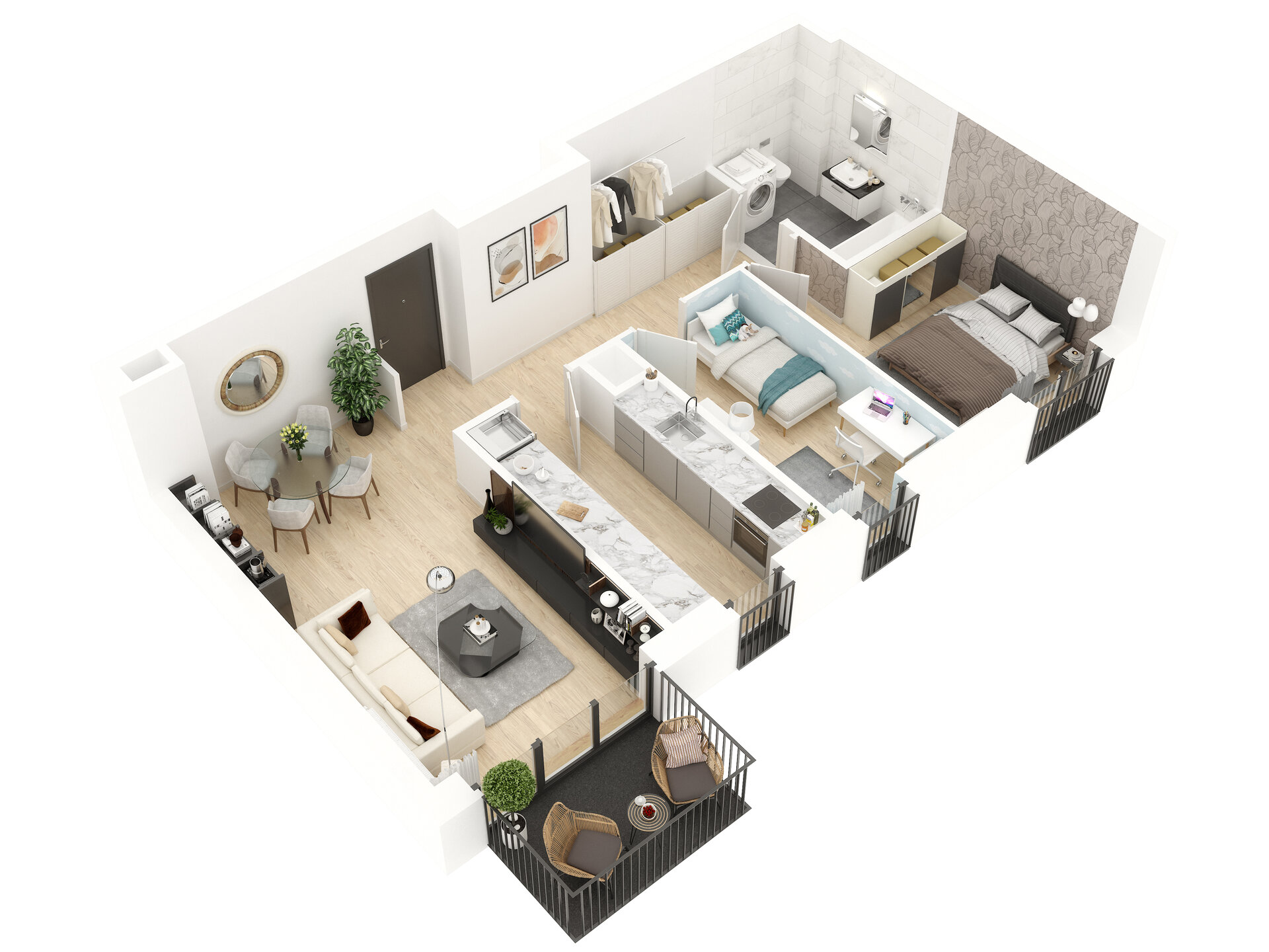 Urządzenia sanitarne i kuchenne, drzwi wewnątrzlokalowe oraz materiały wykończeniowe podłóg nie stanowią wyposażenia lokali mieszkalnych. Rozmieszczenie wyposażenia przedstawiono jako przykładowe.