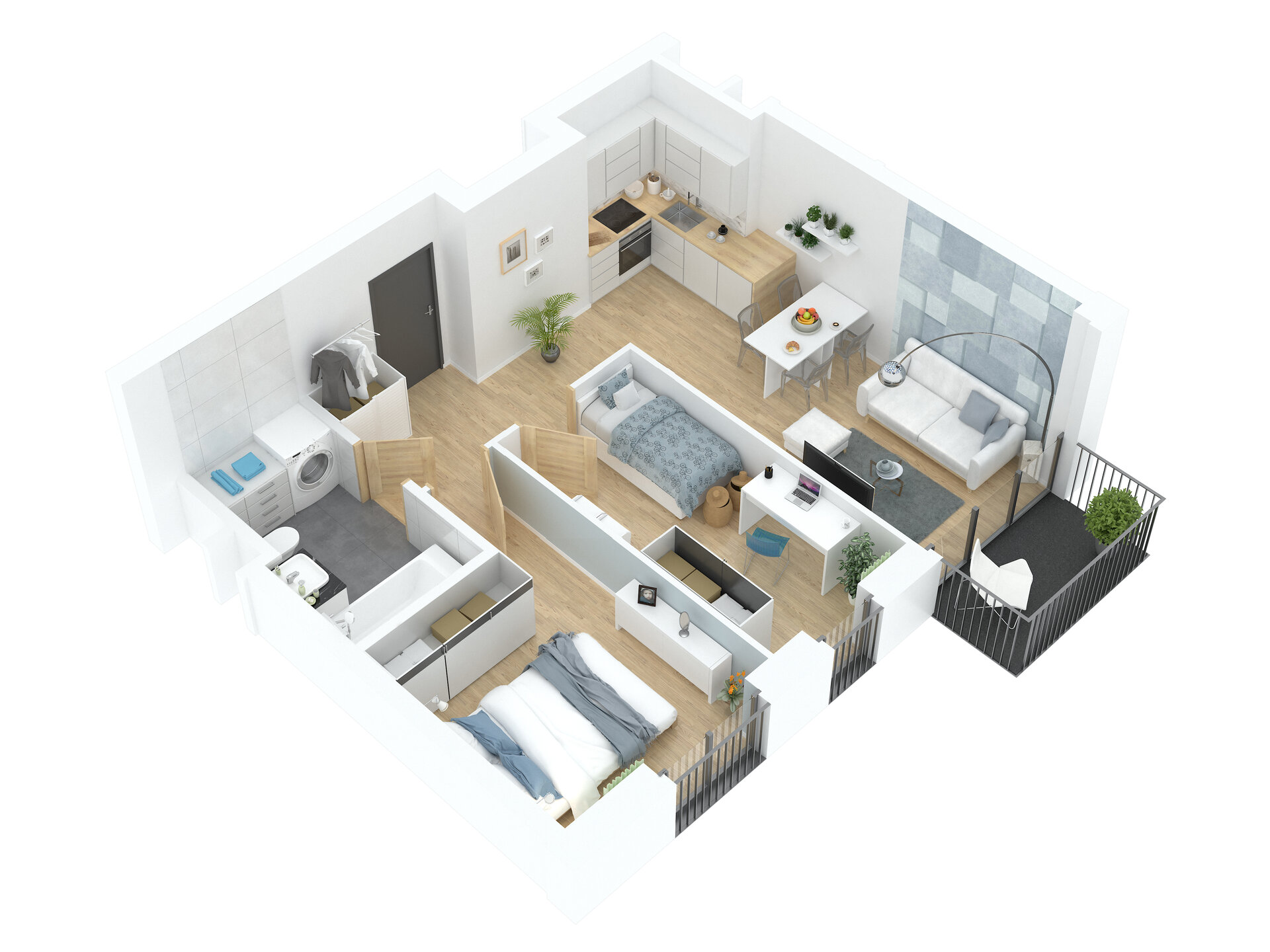 Urządzenia sanitarne i kuchenne, drzwi wewnątrzlokalowe oraz materiały wykończeniowe podłóg nie stanowią wyposażenia lokali mieszkalnych. Rozmieszczenie wyposażenia przedstawiono jako przykładowe.