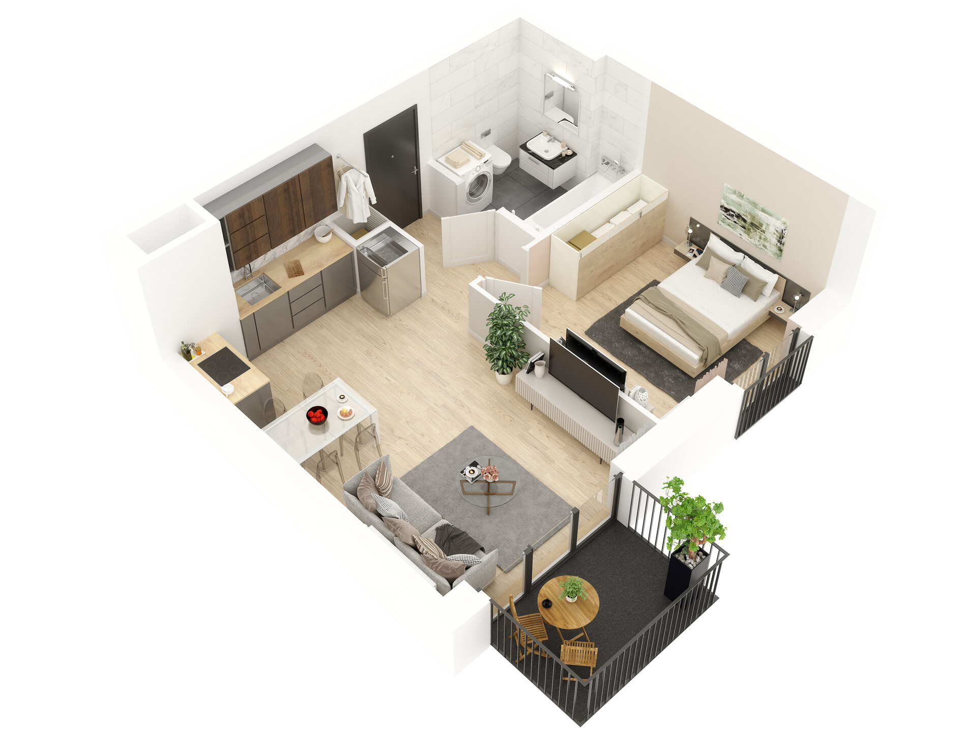 Urządzenia sanitarne i kuchenne, drzwi wewnątrzlokalowe oraz materiały wykończeniowe podłóg nie stanowią wyposażenia lokali mieszkalnych. Rozmieszczenie wyposażenia przedstawiono jako przykładowe.
