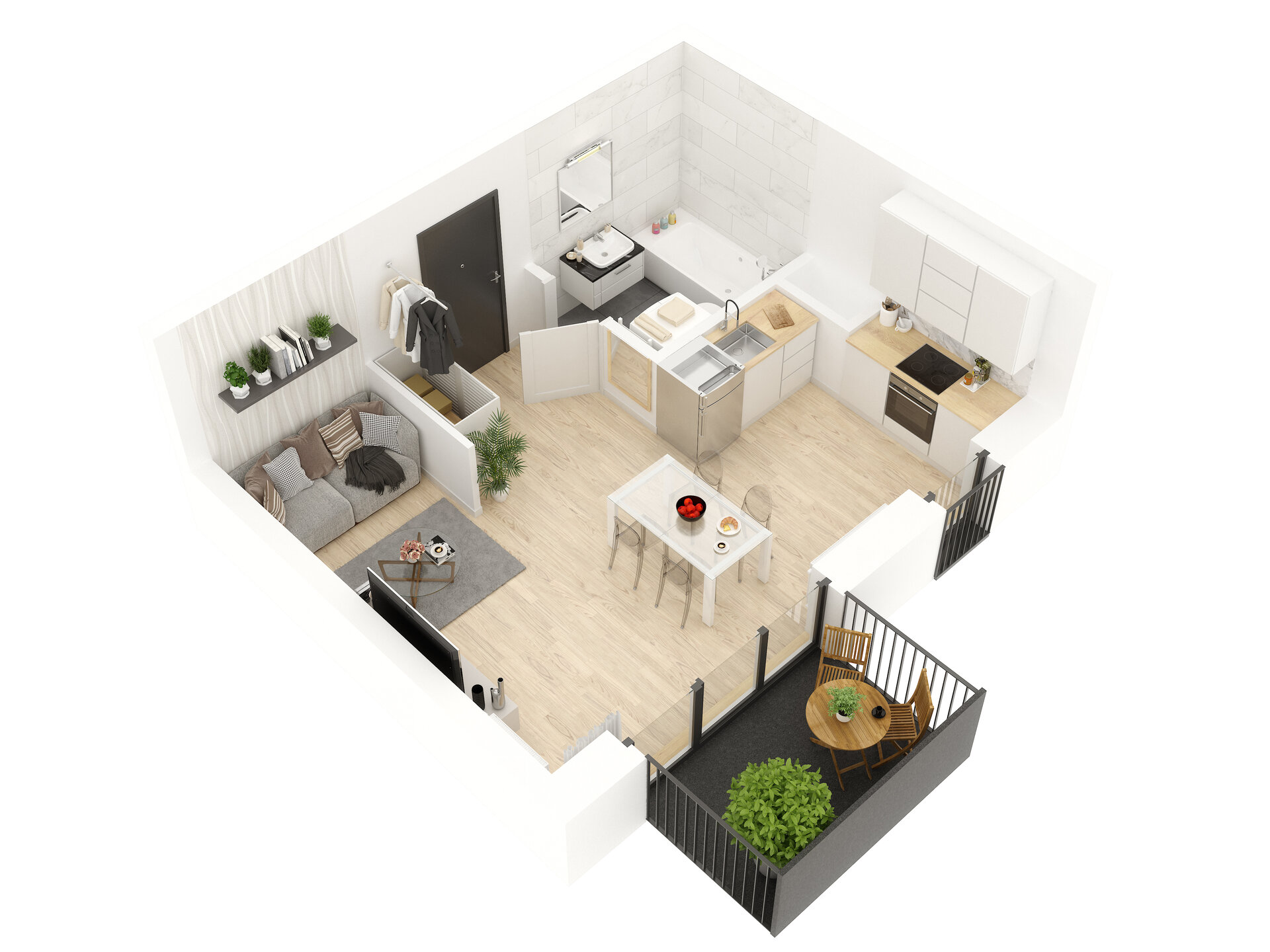 Urządzenia sanitarne i kuchenne, drzwi wewnątrzlokalowe oraz materiały wykończeniowe podłóg nie stanowią wyposażenia lokali mieszkalnych. Rozmieszczenie wyposażenia przedstawiono jako przykładowe.