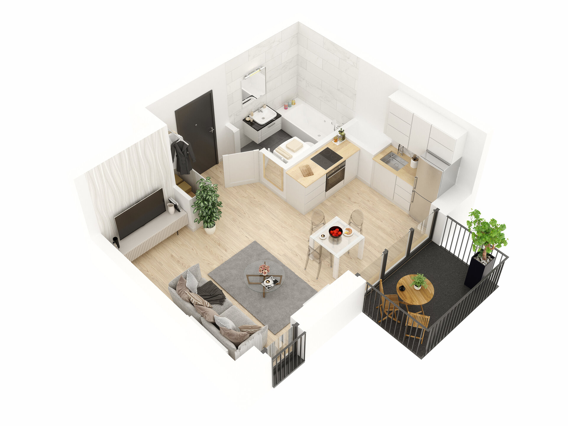 Urządzenia sanitarne i kuchenne, drzwi wewnątrzlokalowe oraz materiały wykończeniowe podłóg nie stanowią wyposażenia lokali mieszkalnych. Rozmieszczenie wyposażenia przedstawiono jako przykładowe.