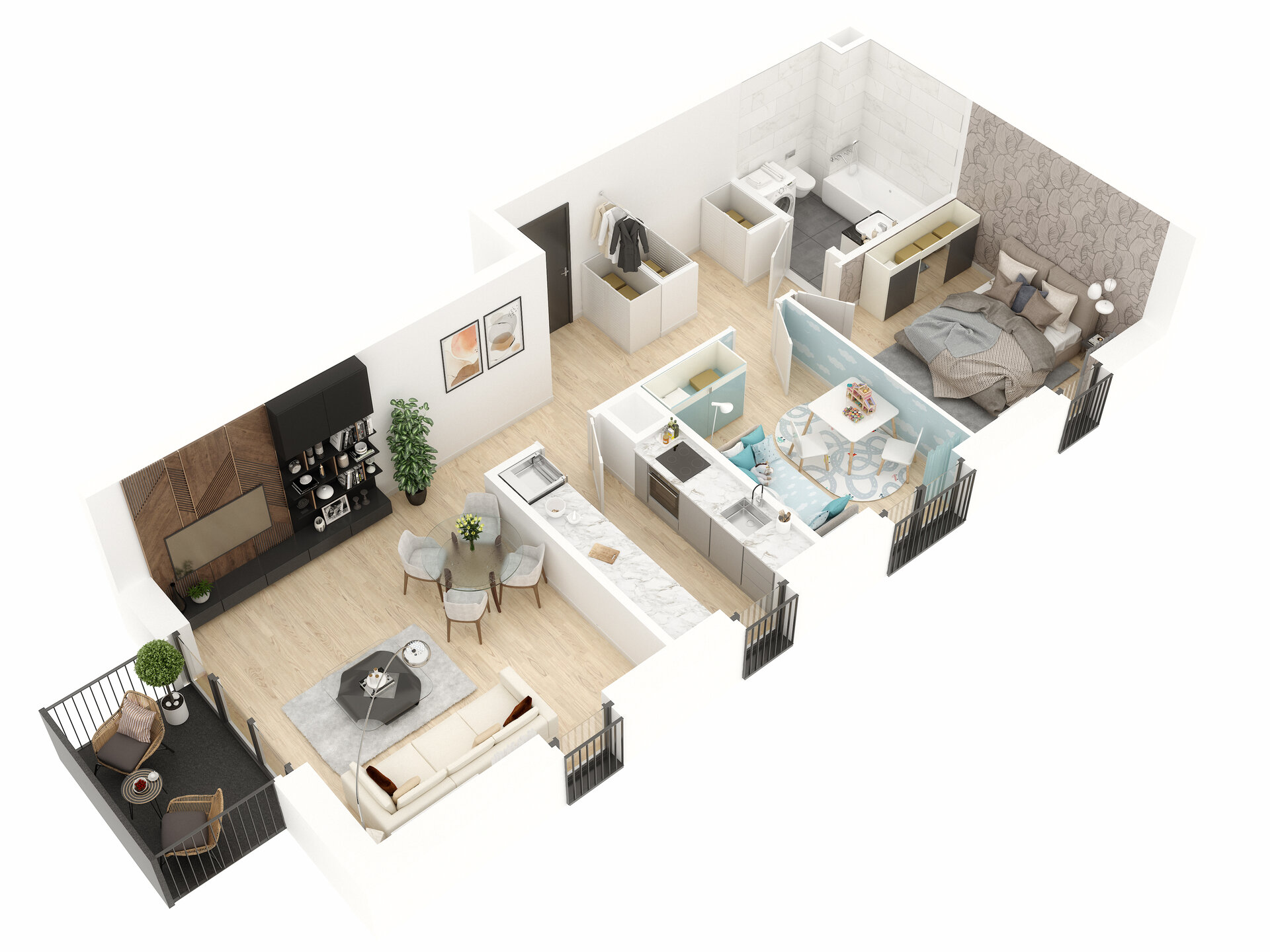 Urządzenia sanitarne i kuchenne, drzwi wewnątrzlokalowe oraz materiały wykończeniowe podłóg nie stanowią wyposażenia lokali mieszkalnych. Rozmieszczenie wyposażenia przedstawiono jako przykładowe.