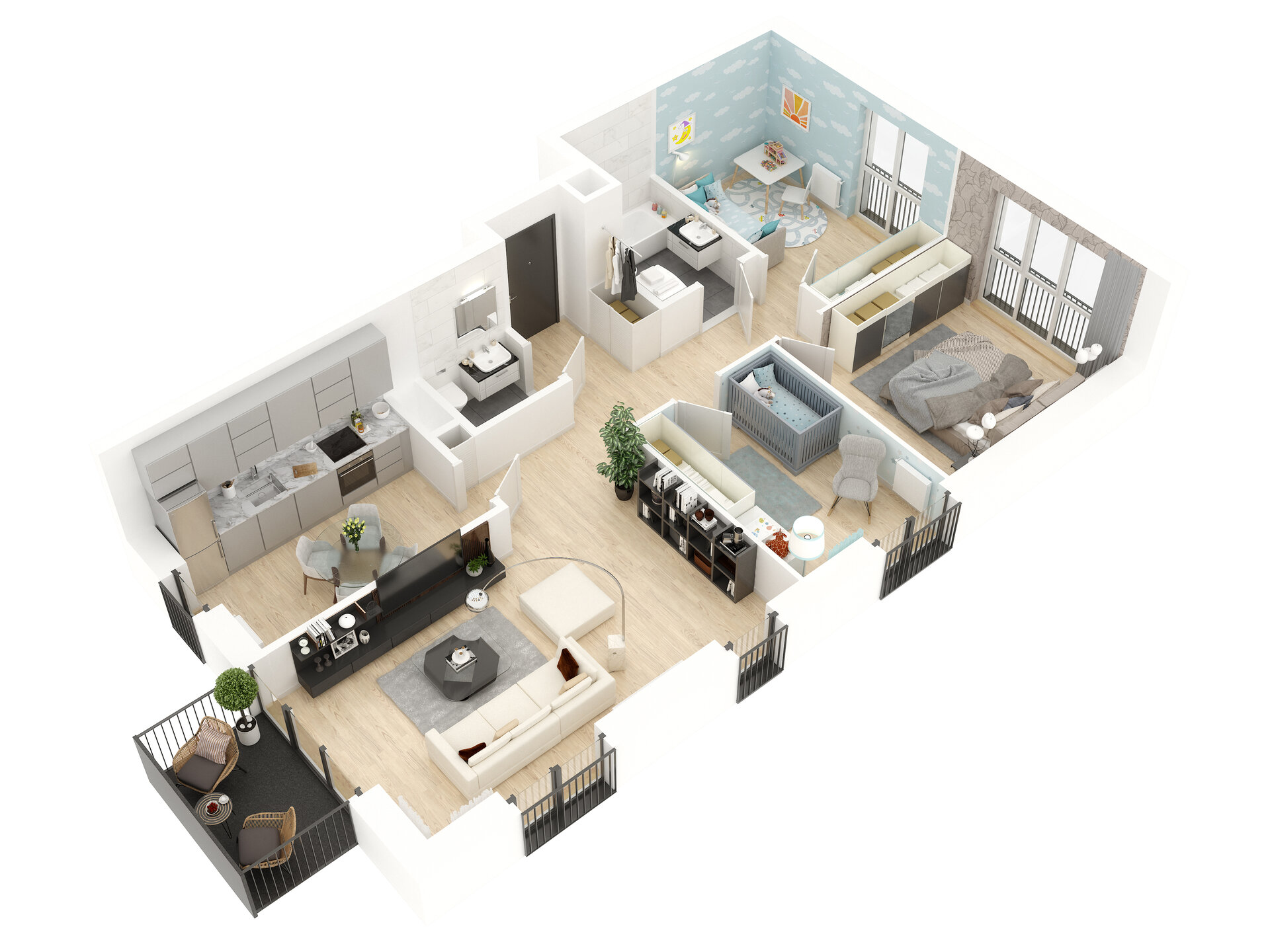Urządzenia sanitarne i kuchenne, drzwi wewnątrzlokalowe oraz materiały wykończeniowe podłóg nie stanowią wyposażenia lokali mieszkalnych. Rozmieszczenie wyposażenia przedstawiono jako przykładowe.