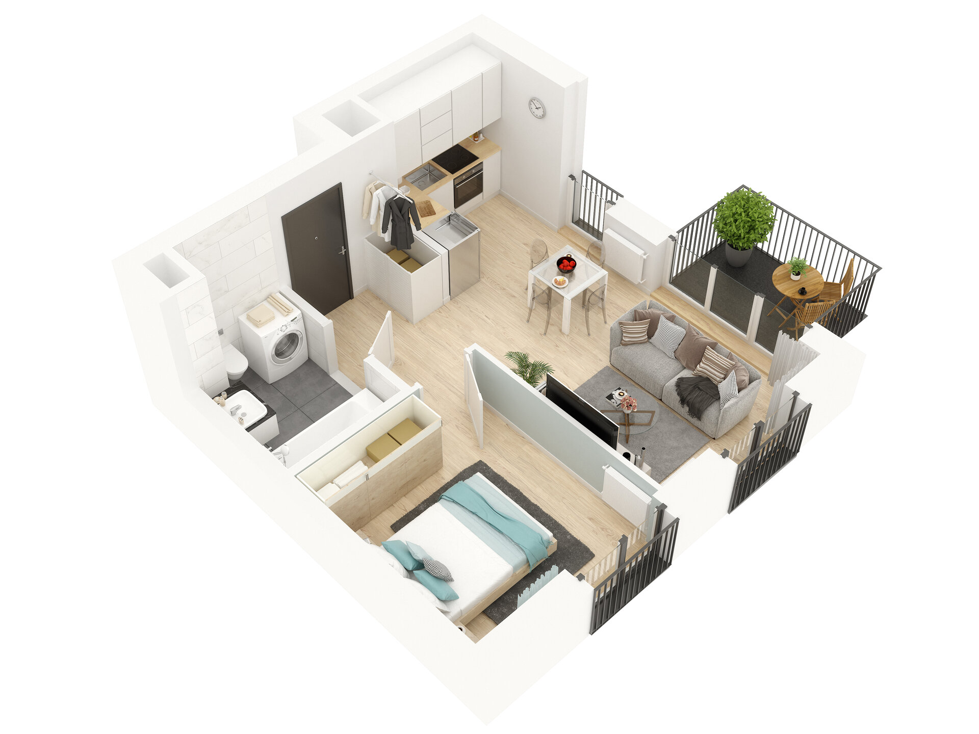 Urządzenia sanitarne i kuchenne, drzwi wewnątrzlokalowe oraz materiały wykończeniowe podłóg nie stanowią wyposażenia lokali mieszkalnych. Rozmieszczenie wyposażenia przedstawiono jako przykładowe.