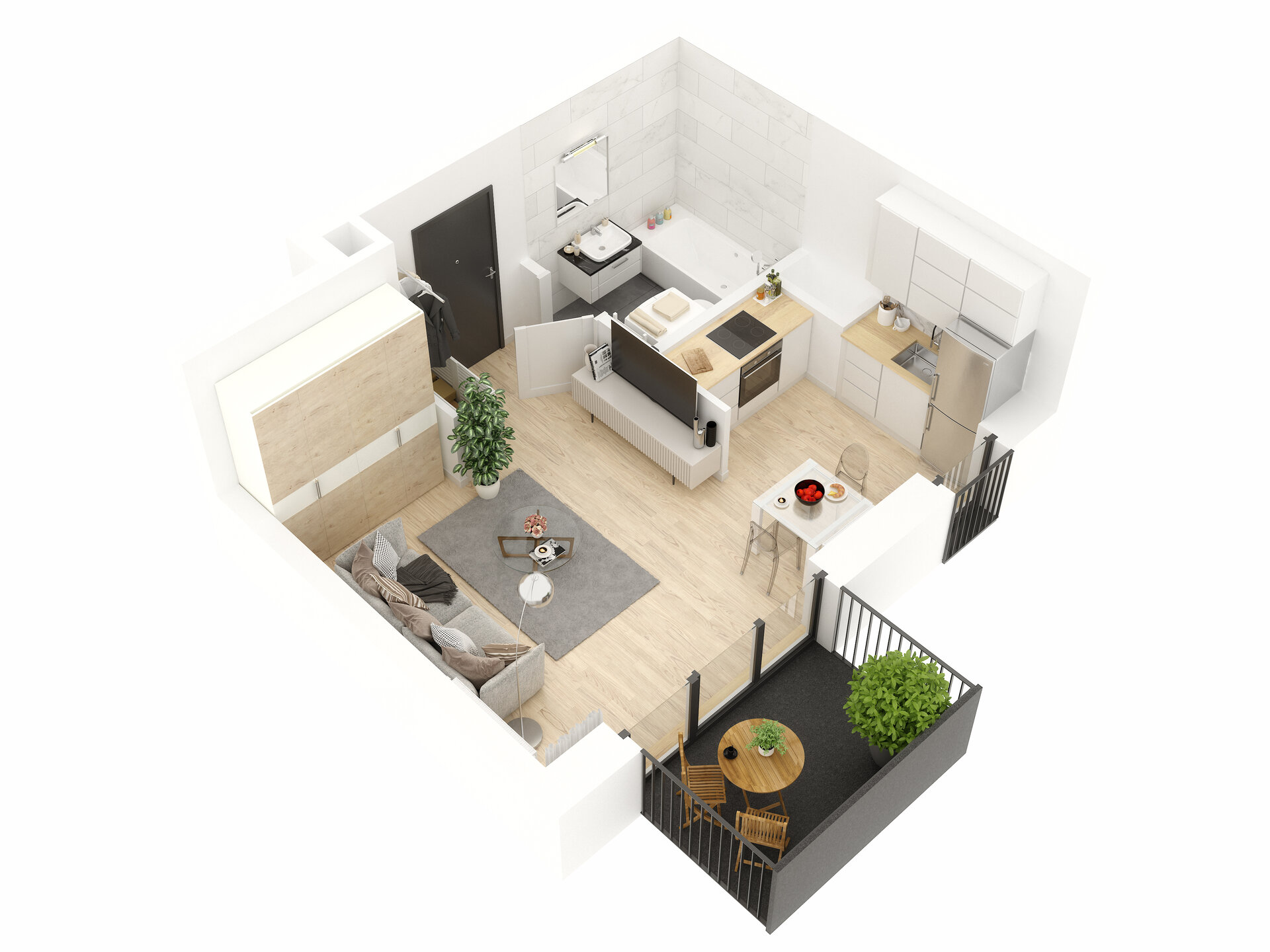 Urządzenia sanitarne i kuchenne, drzwi wewnątrzlokalowe oraz materiały wykończeniowe podłóg nie stanowią wyposażenia lokali mieszkalnych. Rozmieszczenie wyposażenia przedstawiono jako przykładowe.