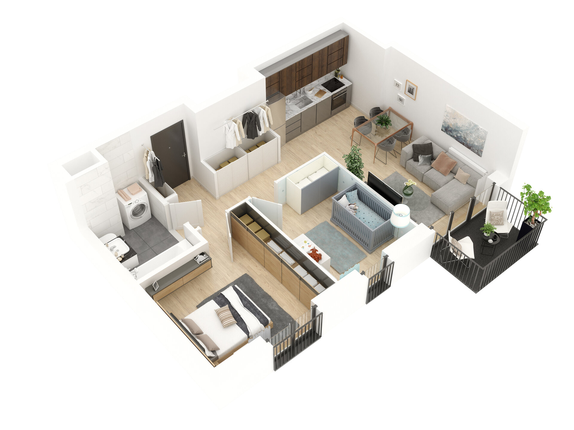 Urządzenia sanitarne i kuchenne, drzwi wewnątrzlokalowe oraz materiały wykończeniowe podłóg nie stanowią wyposażenia lokali mieszkalnych. Rozmieszczenie wyposażenia przedstawiono jako przykładowe.