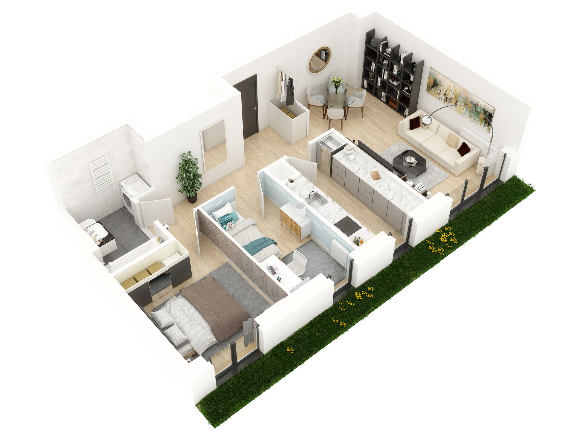 Urządzenia sanitarne i kuchenne, drzwi wewnątrzlokalowe oraz materiały wykończeniowe podłóg nie stanowią wyposażenia lokali mieszkalnych. Rozmieszczenie wyposażenia przedstawiono jako przykładowe.