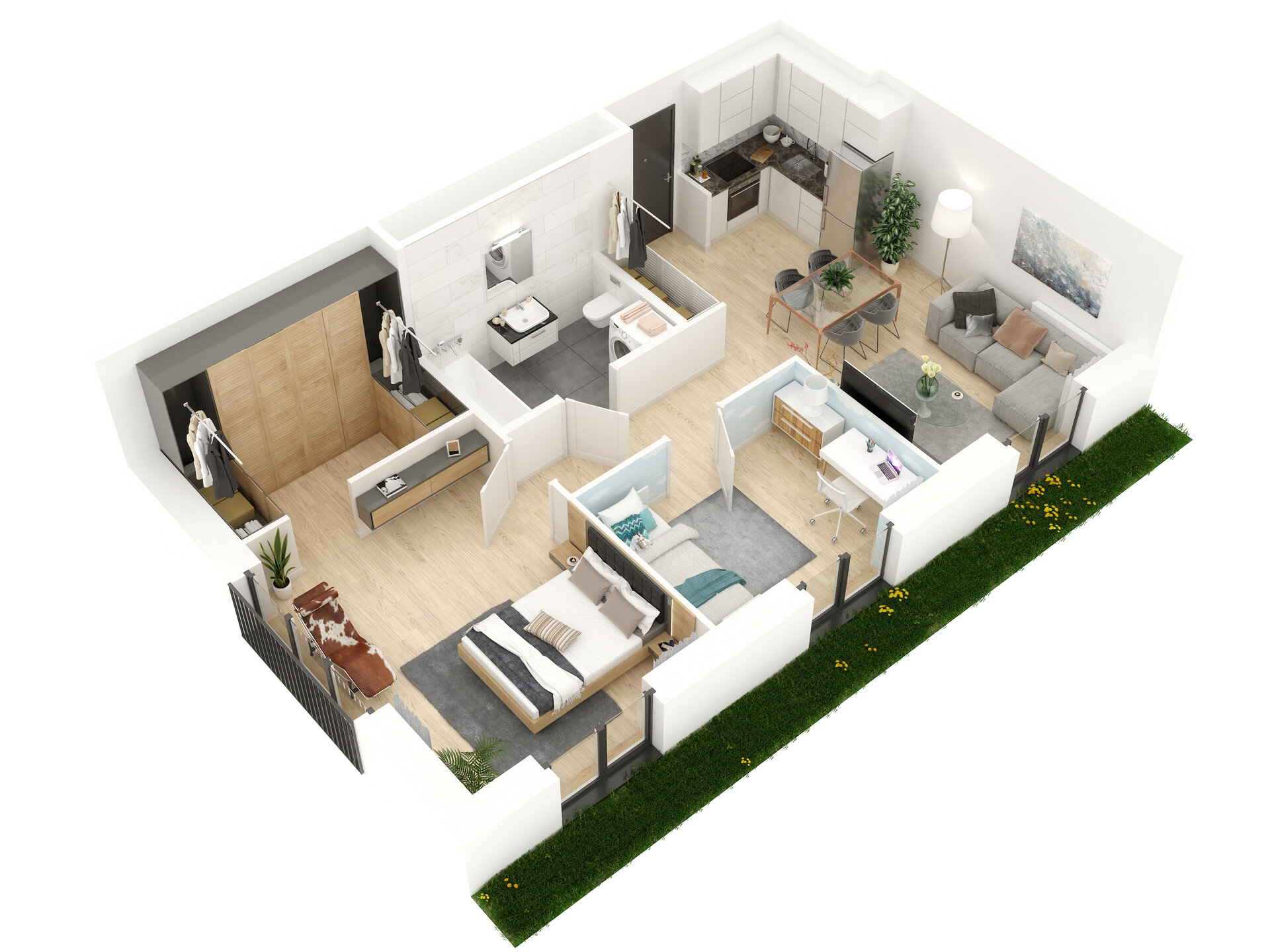 Urządzenia sanitarne i kuchenne, drzwi wewnątrzlokalowe oraz materiały wykończeniowe podłóg nie stanowią wyposażenia lokali mieszkalnych. Rozmieszczenie wyposażenia przedstawiono jako przykładowe.